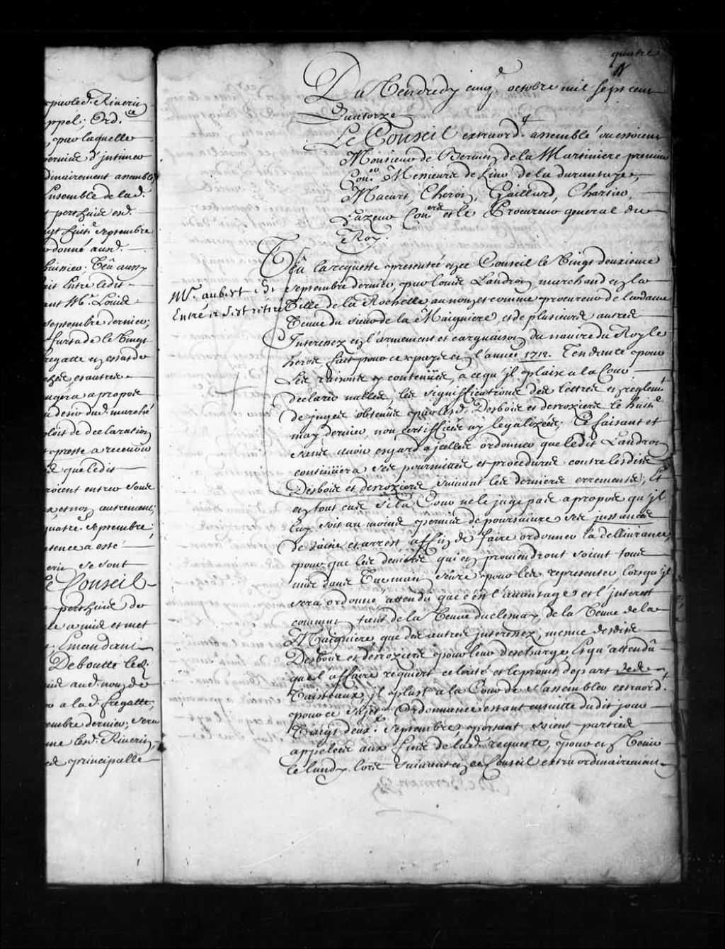 - Transcription du texte avec orthographe modernisée : «Du vendredi cinquième octobre mille sept cent quatorze. Le Conseil extraordinairement assemblé où étaient Monsieur de Bermen de la Martinière premier conseiller Messieurs Delino (De Lino), de Ladurantaye, Macart (Macard), Cheron, Gaillard, Chartier, Hazeur conseillers et le procureur général du Roi. Monsieur Aubert est entré et s'est retiré. Vu la requête présentée en ce Conseil le vingt-deuxième septembre dernier, par Louis Landron, marchand en la ville de La Rochelle, au nom et comme procureur de la dame veuve du sieur de La Maignière, et de plusieurs autres intéressés en l'armement et cargaison du navire du Roi le Héros, fait pour ce pays en l'année 1712. tendante pour les raisons y contenues, à ce qu'il plaise à la Cour déclarer nulles, les significations des lettres en règlement de juges obtenus par lesdits Desbois et Desrosiers le huitième mai dernier, non certifiées ni [...]