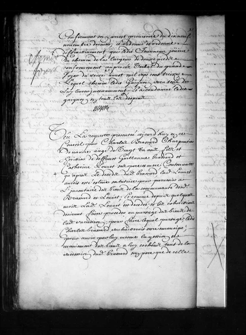 - Transcription du texte avec orthographe modernisée : «Vu la requête présentée ce jourd'hui en ce Conseil par Charles Brassard charpentier de navire âgé de vingt et un ans, fils et héritier de défunt Guillaume Brassard et Catherine Louvet ses père et mère; contenante qu'après le décès dudit Brassard, ladite Louvet aurait été élue sa tutrice pour parvenir à l'inventaire des biens de la communauté desdits Brassard et Louvet; et comme depuis quelques mois ladite Louvet est décédée; et les cohéritiers désirant faire procéder au partage des biens de ladite succession; pour faire lequel partage, ledit Charles Brassard souhaiterait être émancipé; pour avoir par lui-même la gestion et maniement des biens à lui échus tant de la succession dudit Brassard son père que de celle de ladite Louvet sa mère, et ce sous l'autorité d'un curateur qui lui sera élu à cet effet; pourquoi il supplie très humblement la Cour de lui accorder lettres de bénéfice d'âge, pour pouvoir procéder au partage des biens de la succession de ladite Louvet, et pouvoir par lui-même à l'avenir avoir la gestion et maniement des biens à lui échus des successions desdits Brassard et Louvet ses père et mère; et ce sous l'autorité d'un curateur aux causes qui lui sera élu à cet effet; vu aussi l'extrait baptistaire dudit Charles Brassard en date du vingt-sixième juillet 1694. Ouï le procureur général du Roi; le Conseil a ordonné et ordonne que par le greffier en chef d'icelui, il sera expédié audit Charles Brassard, lettres de bénéfice d'âge, et d'émancipation, adressantes aux officiers de la prévôté de cette ville pour être entérinées si faire se doit. BEGON.»