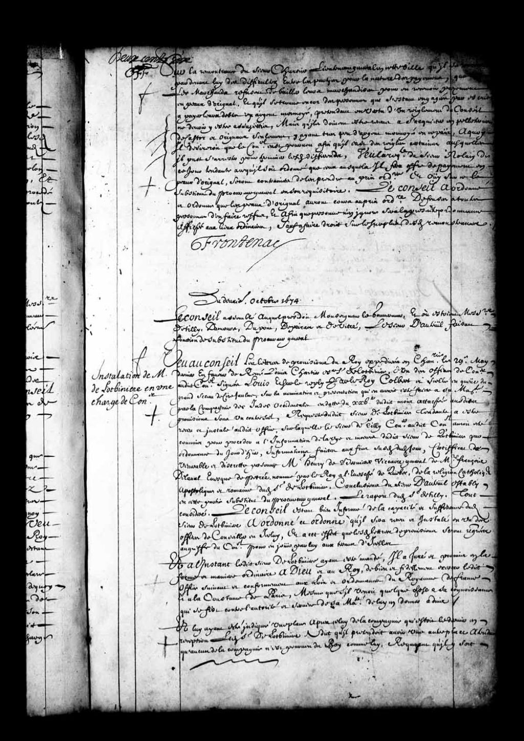 - Transcription du texte avec orthographe modernisée : «Sur la remontrance du sieur Chartier lieutenant général en cette ville qu'il se rencontre par-devant lui des difficultés entre les parties pour la nature des payements, que même les marchands refusent de bailler leurs marchandises pour en recevoir payement en peaux d'orignal, et qu'il se trouve encore des personnes qui s'étant engagées par écrit à payer leurs dettes en argent monnayé, prétendant en vertu d'un règlement du Conseil ne devoir y être assujettis, mais qu'ils doivent être reçus à s'acquitter en pelleteries de castor et orignaux seulement, y ayant très peu d'argent monnayé en ce pays, à quoi il désirerait que le Conseil eût pourvu afin qu'il eût des règles certaines auxquelles il put s'arrêter pour terminer lesdits différents; vu la requête du sieur Nolan de ce jour tendante à ce qu'il soit ordonné que ceux auxquels il fera offre de payement en peaux d'orignal, soient contraints de les prendre au prix ordinaire; et ouï sur ce le substitut du procureur général en son réquisitoire. Le Conseil a ordonné et ordonne que les peaux d'orignal auront cours au prix ordinaire, défenses à toutes personnes d'en faire refus; et afin que personne n'en ignore sera la présente ordonnance affichée aux lieux ordinaires, sauf à faire droit sur le surplus desdites remontrances. FRONTENAC.»
