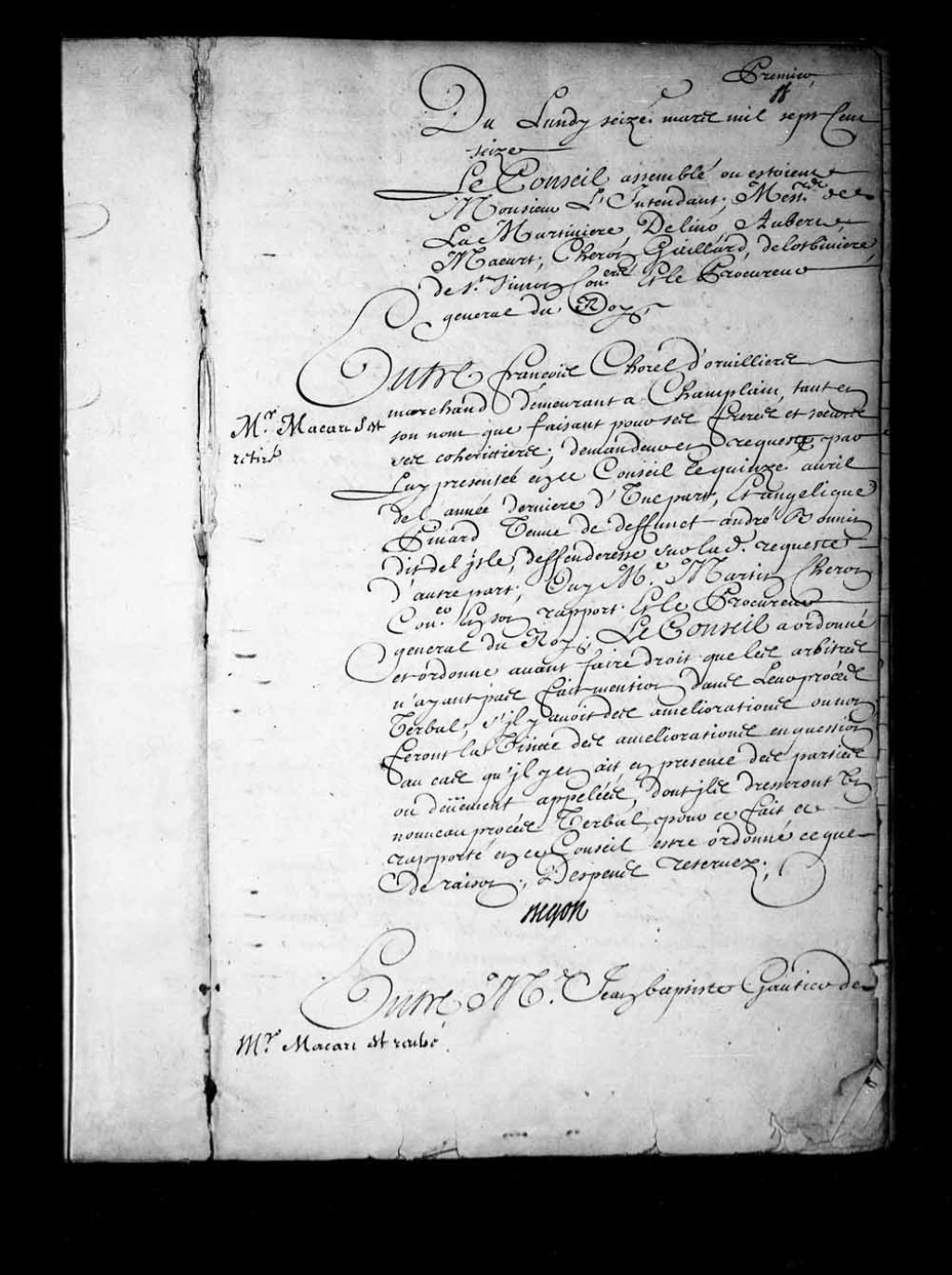 - Transcription du texte avec orthographe modernisée : «Monsieur Macart (Macard) est rentré. Entre maître Jean-Baptiste GAUTIER (Gauthier) de VARENNES prête procureur des sieurs ecclésiastiques du séminaire des missions étrangères établi en cette ville, propriétaires du fief, terre et seigneurie de Beaupré; demandeur en requête par lui présentée en ce Conseil le septième février dernier; comparant par maître Etienne Dubreuil notaire en la prévôté de cette ville d'une part; et dame Marie Catherine PEUVRET veuve de de sieur Ignace Juchereau écuyer sieur Duchesnay et de Beauport; et Joseph JUCHEREAU son fils aîné; défendeurs sur ladite requête; comparants par maître Florent de LaCettierre (Lacetière) aussi notaire en ladite prévôté d'autre part; ouïs lesdits comparants; vu ladite requête ensuite de laquelle est l'ordonnance dudit jour septième février dernier; portant défenses à ladite dame veuve Duchesnay et au sieur Duchesnay son fils aîné [...]