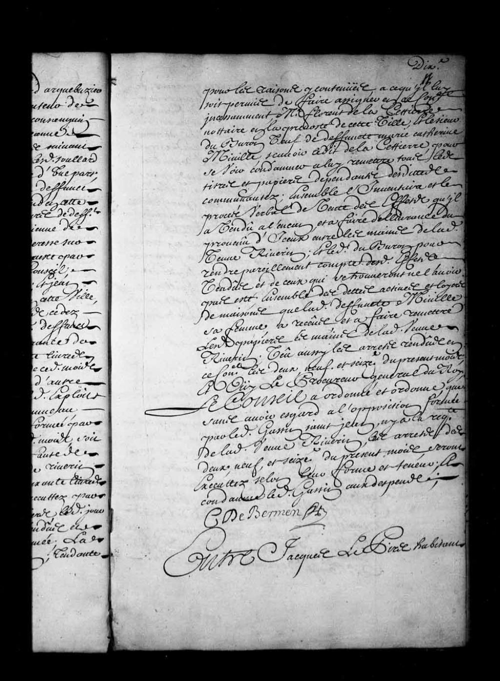 - Transcription du texte avec orthographe modernisée : «Entre Jacques LEPIRS (Lepire) habitants de la seigneurie de Saint-Ignace, paroisse de Charlesbourg, anticipant comparant par Monsieur Jean Petit trésorier de la marine en ce pays son procureur d'une part, et les Dames religieuses de l'Hôtel-Dieu de cette ville, appelantes de sentence rendue en la prévôté de cette dite ville le neuvième décembre dernier; et anticipées; comparantes par maître Florent de Lacettierre (Lacetière) notaire en ladite prévôté leur procureur d'autre part, ouïs lesdits comparants, ensemble le procureur général du Roi; le Conseil a appointé et appointe les parties en droit à fournir de griefs, de réponses à iceux, écrire et produire dans les délais de l'ordonnance, par-devant maître Guillaume Gaillard, conseiller pour à son rapport être ordonné ce que de raison; dépens réservés. C. DE BERMEN»