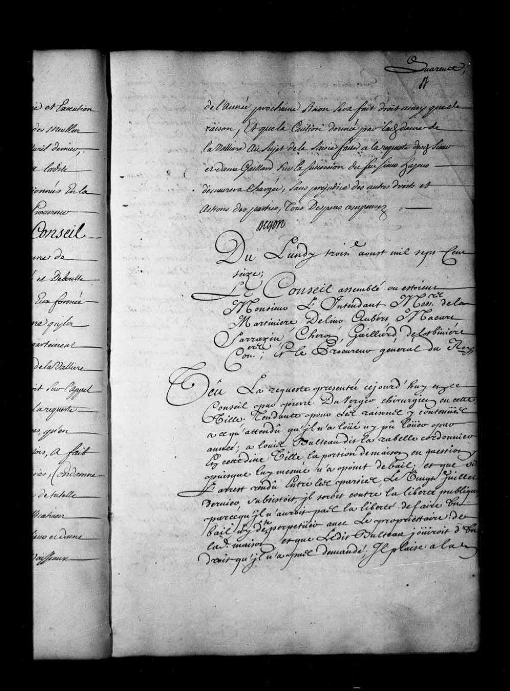 - Transcription du texte avec orthographe modernisée : «Du lundi troisième août mille sept cent seize. Le Conseil assemblé où étaient Monsieur l'intendant, Messieurs de la Martinière, Delino (De Lino), Aubert, Macart (Macard), Sarrazin, Cheron, Gaillard, de Lotbinière conseillers; et le procureur général du Roi; Vu la requête présentée ce jourd'hui en ce Conseil par Pierre Duverger (Du Verger) chirurgien en cette ville; tendante pour les raisons y contenues à ce qu'attendu qu'il n'a loué ni pu louer par année; à Louis Bulteau (Bluteau) dit Larabelle cordonnier en cette dite ville, la portion de maison en question, puisque lui-même n'a point de bail; et que si l'arrêt rendu entre les parties le vingtième juillet dernier, subsistait, il serait contre la liberté publique, parce qu'il n'aurait pas la liberté de faire un bail, ni de se perpétuer avec le propriétaire de ladite maison, et que ledit Bulteau jouirait d'un droit qu'il n'a pas [...]