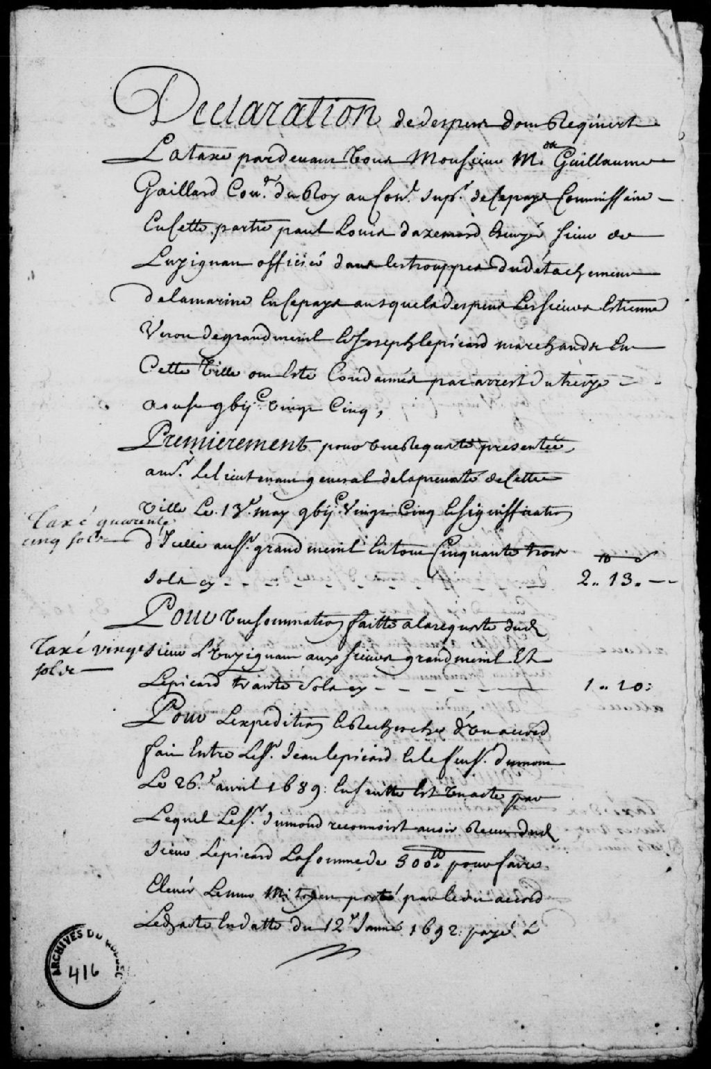 - Mémoire des dépens à payer par les sieurs Grandmesnil et Lepicard, marchands de Québec, à Paul-Louis Dazemard de Lusignan (Dazemar), officier des troupes de la Marine, à la suite de l'arrêt du Conseil supérieur de Québec du 13 août 1725