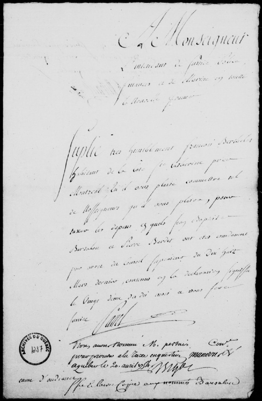 - Mémoire des dépens à payer par Jean-Baptiste Barsalou, tanneur, et Pierre Bardet, à la requête de François Berthelot, habitant de la côte Sainte-Catherine, près de Montréal, à la suite de l'arrêt du Conseil supérieur de Québec du 18 mars 1754