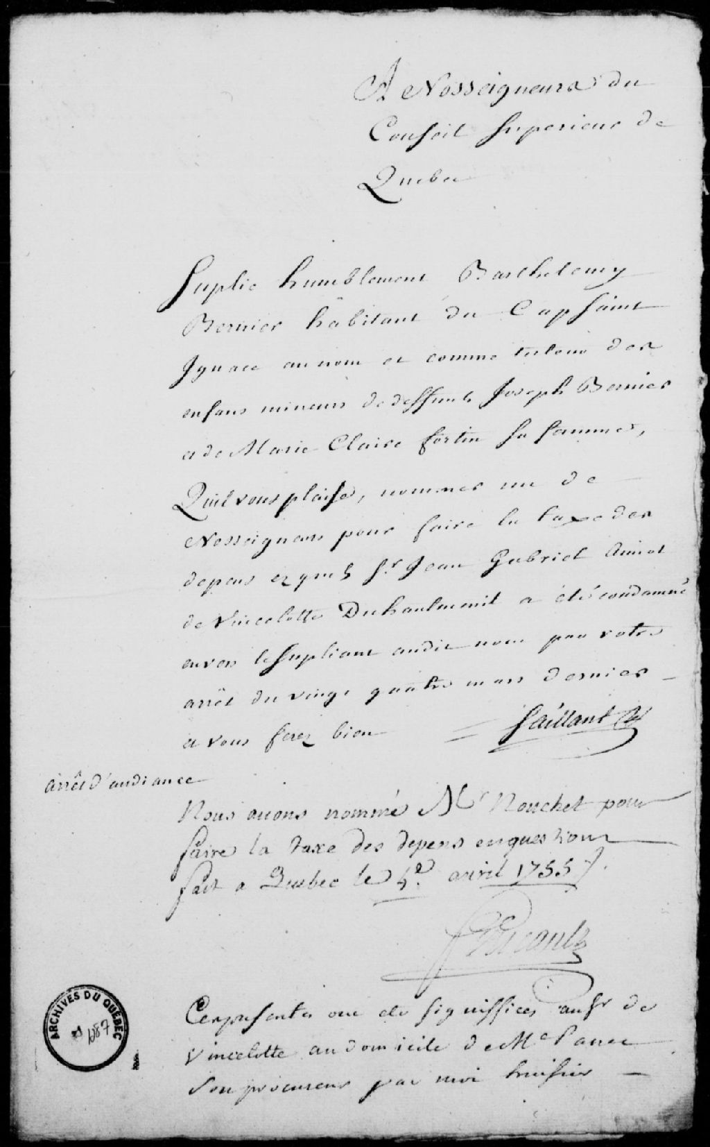 Mémoire des dépens à payer par Jean-Gabriel Amiot de Vincelotte du Hautmesnil (Amyot de Vincelot), à la requête de Barthélemi Bernier, habitant du Cap-Saint-Ignace, au nom et comme tuteur des enfants mineurs de feu Joseph Bernier et de Marie-Claire Fortin, sa femme, à la suite de l'arrêt du Conseil supérieur de Québec du 24 mars 1755
