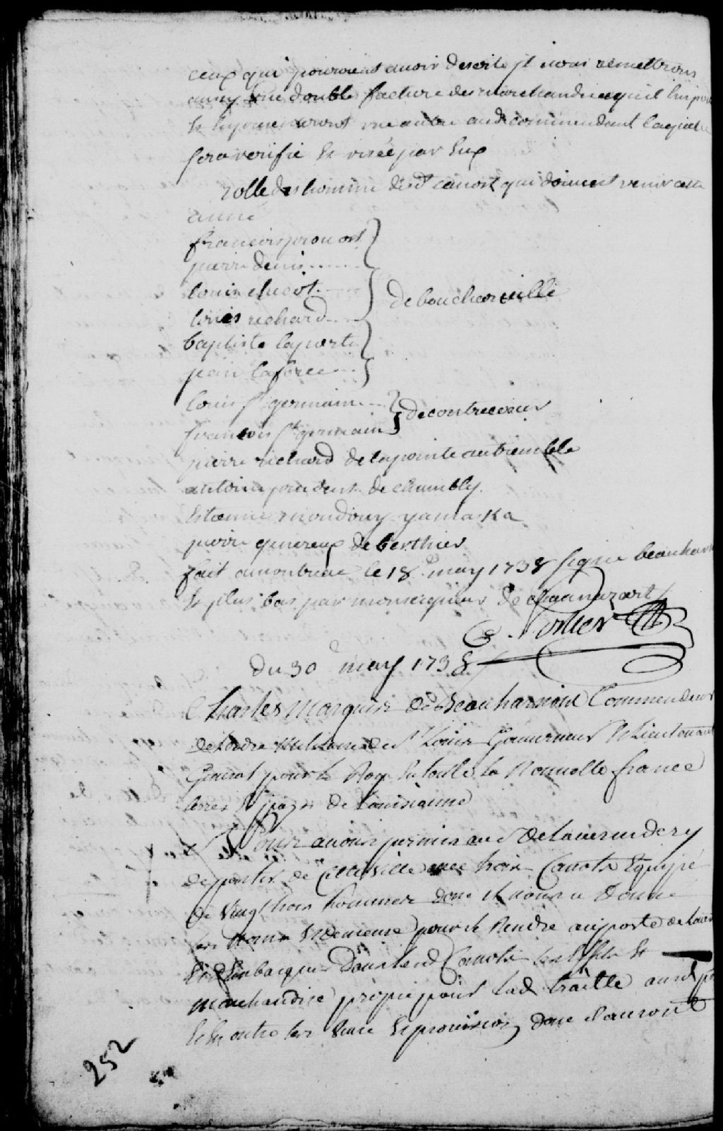 Congé de trois canots par Charles de Boische, Marquis de Beauharnois, gouverneur de la Nouvelle-France, au sieur de la Verendery (LaVérenderie, LaVérandrye), lesquels canots devant partir de Montréal pour se rendre au poste de l'Ouest et devant contenir à leur bord vingt-trois hommes en tout, à savoir Alexis Limouzin dit Sansachin (Sanschagrin), caporal de la compagnie de Duvivier, Nicolas Roger dit Sansfaçon, soldat de la compagnie de Laperrière, Antoine Soyer dit Vadeboncoeur, soldat de la compagnie de Varenne (Varennes), Jacques Nouvelle dit LaPénisse, soldat de la compagnie de Lafrenière, Jean Allard dit Jolicoeur, soldat de la compagnie de Contrecoeur, François Mailliou (Maillou, Mailloux) et Jean Truiller Lacombe (Trullier), forgeron, tous deux de Montréal, Antoine Mesnard (Ménard), Pierre Boisleau (Boileau) et Antoine Rocbert dit Lafontaine (Robert), tous de Chambly, Jacques Lepage dit Roy, Pierre Barthélémy et Louis Galoudek (Galloudec, Galoudet), tous de Québec, Pierre Chicouane (Chicoine), de Verchères, François Pillet (Pilet), de Lachine, Nicolas Girard, de Verdun, Pierre Roy et Jean Vaine (Venne), de la Pointe-aux-Trembles, et Pierre Salvaille (Salvail, Salvaye) et Pierre Lavallé (Lavallée), de Sorel, 23 mai 1738, Archives nationales à Québec, Fonds Conseil souverain, (03Q,TP1,S35,D9,P130).