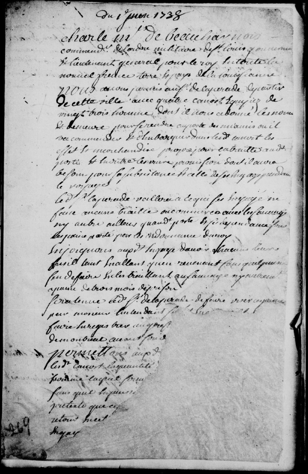 Congé de quatre canots par Charles de Boische, Marquis de Beauharnois, gouverneur de la Nouvelle-France, au sieur de la Pérade (LaPérade), lesquels canots devant partir de Montréal pour se rendre au poste des Miamis, où va commander ledit sieur de la Pérade, et devant contenir à leur bord vingt-trois hommes en tout, dont le nommé Gouin, conducteur du canot, de Sainte-Anne, les nommés Beauchêne (Beauchesne), Sainte-Marie, Tousignan et Perthuy (Perthuis), de Québec, deux nommés Couturier, de Sainte-Anne, les nommés Jean, François et Antoine Grignon, des Grondines, et le nommé Joseph, François Lorenge (Loranger) et Labisioniere (Labissonière), tous trois de Batiscan