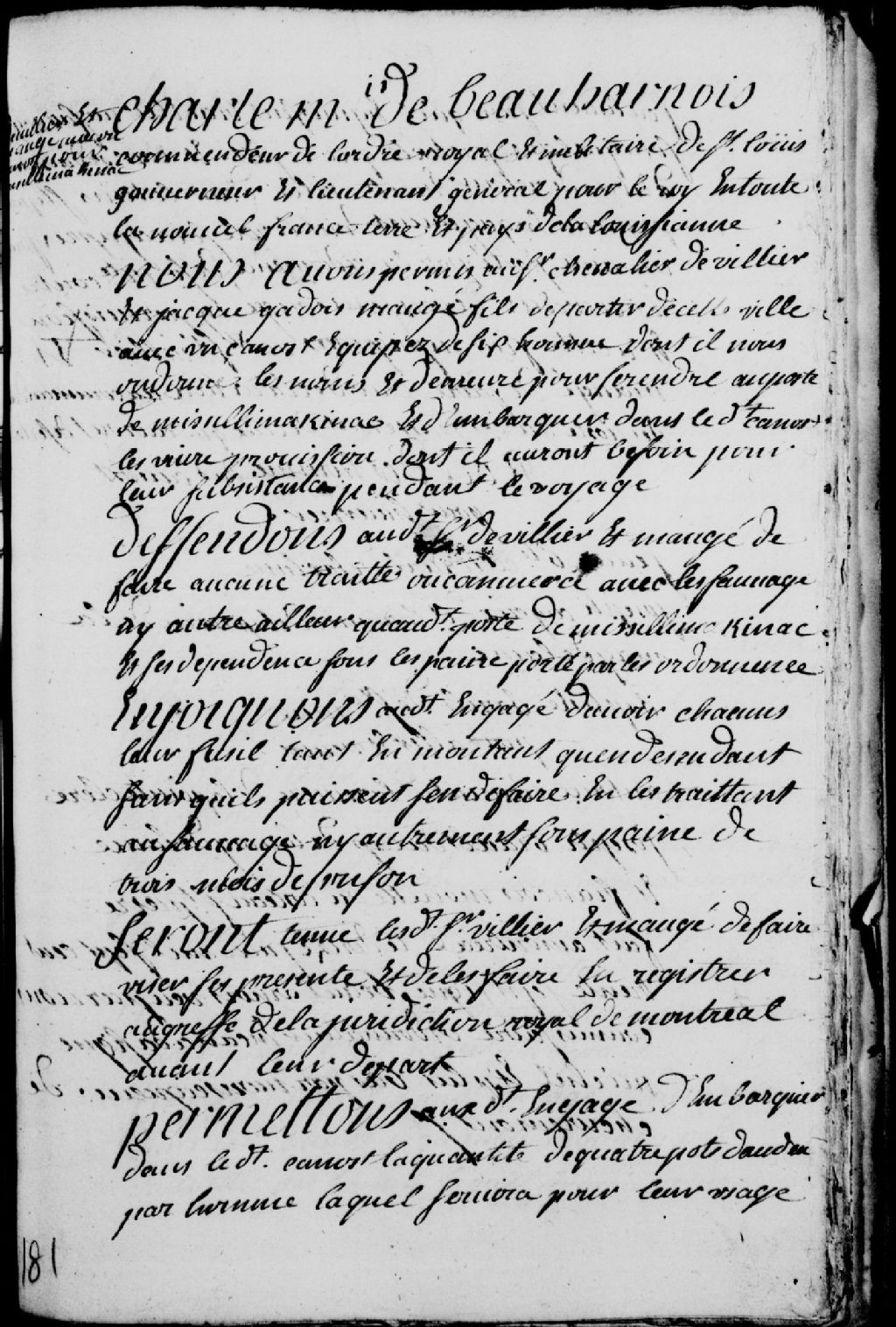 Congé d'un canot par Charles de Boische, Marquis de Beauharnois, gouverneur de la Nouvelle-France, au sieur Chevalier de Villier (Villiers) et Jacques Gadois Maugé (Mauger) fils, lequel canot devant partir de Montréal pour se rendre au poste de Michilimakinac et devant contenir à son bord six hommes, à savoir Jean-Baptiste Cardinal, de Lachine, Joseph Auprix dit Laramée (Aupry), de la Prairie-de-la-Madeleine, Baptiste Baril, de Sainte-Anne, Antoine Clément dit Larivière, de la Pointe-Claire, Joseph Brault, du Cap-de-la-Madeleine, et François Monette (Monet), du coteau Saint-Pierre