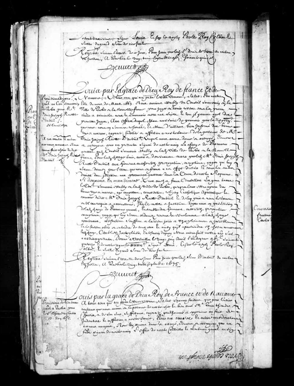 Provisions par le Roi au sieur Denis-Joseph Ruette d'Auteuil de la charge de procureur général du Conseil souverain de Québec, 25 avril 1674, Archives nationales à Québec, Fonds Conseil souverain, (03Q,TP1,S36,P111).