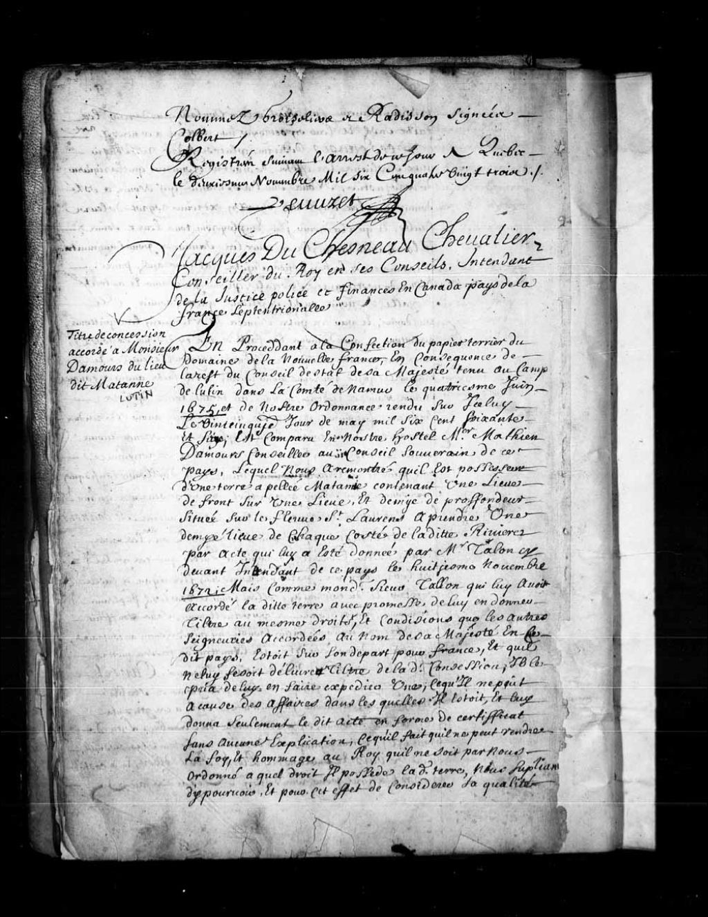 Concession par Jacques Duchesneau, intendant de la Nouvelle-France, à Mathieu Damours (d'Amours), conseiller au Conseil souverain de la Nouvelle-France, de la terre appelée Matane contenant une lieue de front sur une lieue et demie de profondeur située sur le fleuve Saint-Laurent, à prendre une demi-lieue de chaque côté de ladite rivière, selon la promesse faite par billet par Jean Talon, alors intendant de la Nouvelle-France, en date du 8 novembre 1672, et, par augmentation, une autre lieue de terre de front aussi sur une lieue et demie de profondeur, à titre de fief et seigneurie avec haute, moyenne et basse justice
