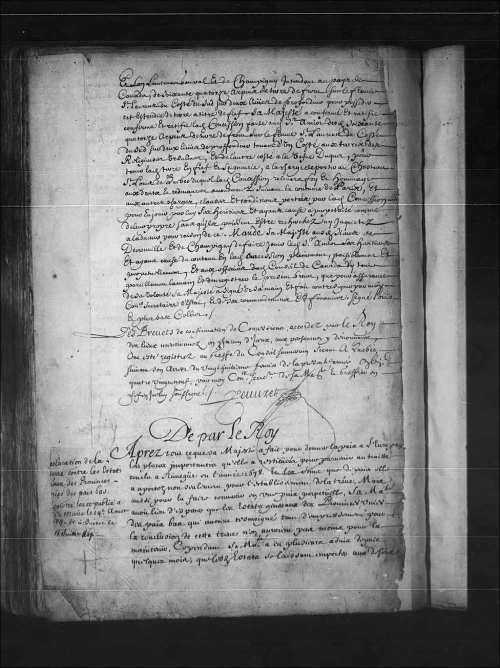 Déclaration de guerre par le Roi aux États Généraux des Provinces Unies des Pays-Bas, 26 novembre 1688, Archives nationales à Québec, Fonds Conseil souverain, (03Q,TP1,S36,P289).