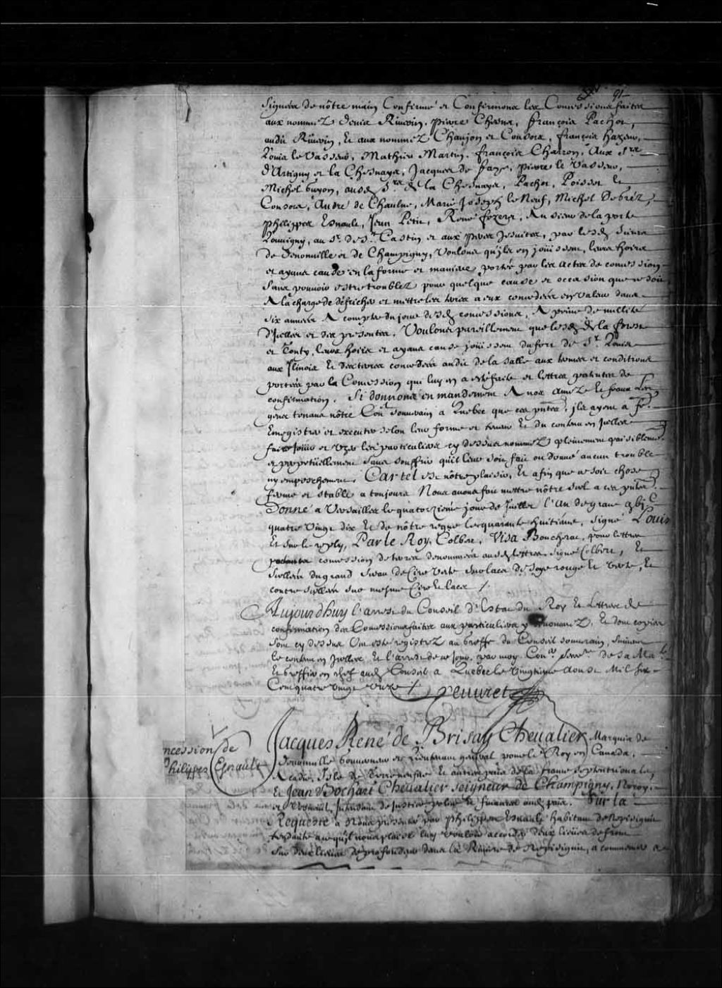 Acte de concession par Jacques-René de Brisay, Marquis de Denonville, et Jean Bochart Champigny, gouverneur et intendant de la Nouvelle-France, au sieur Philippe Esnault (Énaud) de deux lieues de terre de front et de deux lieues de profondeur donnant sur la rivière Nipisiguit à l'Acadie, à commencer dans l'embouchure de ladite rivière jusqu'à deux lieues en la remontant, laquelle concession comprenant en outre le droit de traite avec les Sauvages (Amérindiens) et le droit de chasse et de pêche dans ladite étendue