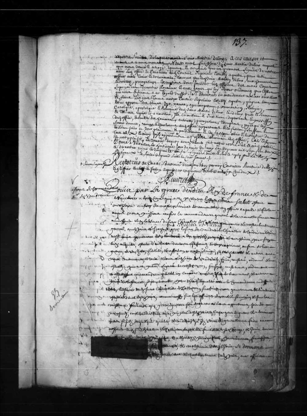 Lettres de provisions de la charge de commandant général de la Nouvelle-France pour le sieur Philippe de Rigaud, Marquis de Vaudreuil, Chevalier de l'Ordre militaire de Saint-Louis, gouverneur de Montréal, au défaut ou en l'absence du sieur Louis-Hector de Callières, Chevalier, gouverneur et lieutenant général audit pays