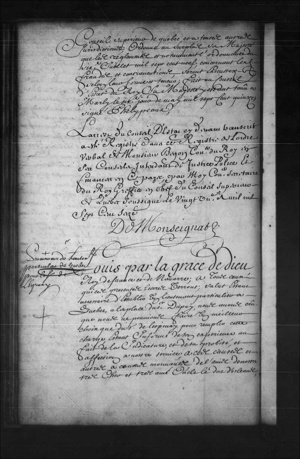 Lettres de provisions par le Roi au sieur Couillard de Lespinay (Lépinay) de l'office de lieutenant particulier de la Prévôté de Québec, à la place du sieur Dupuy (Dupuis), 27 avril 1716, Archives nationales à Québec, Fonds Conseil souverain, (03Q,TP1,S36,P503).