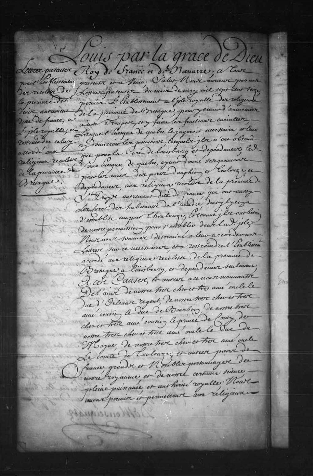 Lettres patentes de Sa Majesté pour l'établissement des Révérends Pères Récollets de la province de Saint-Denis, autrement dit de France, à l'île Royale, et restreindre celui accordé aux Révérends Pères Récollets de la province de Bretagne, à Louisbourg et dépendances seulement, 1er mai 1717 - 31 mai 1717, Archives nationales à Québec, Fonds Conseil souverain, (03Q,TP1,S36,P552).