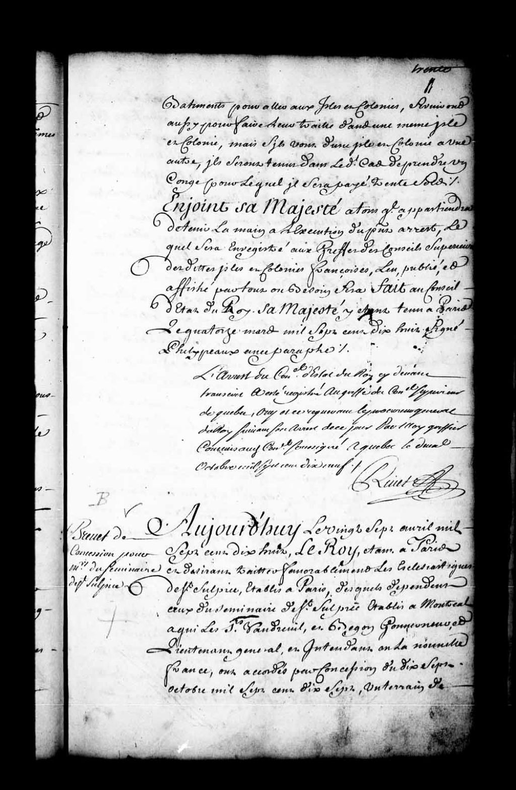 Brevet de confirmation par le Roi en faveur des Ecclésiastiques du Séminaire de Saint-Sulpice établi à Montréal de la concession leur ayant été accordée le 17 octobre 1717 par Philippe de Rigaud, marquis de Vaudreuil, et Michel Bégon, gouverneur et intendant de la Nouvelle-France, d'un terrain de trois lieues et demie de front sur trois lieues de profondeur pour y transporter la mission des Sauvages (Amérindiens) du Sault-au-Récollet dont ils sont chargés et ce aux charges, clauses et conditions mentionnées en ladite concession, 27 avril 1718, Archives nationales à Québec, Fonds Conseil souverain, (03Q,TP1,S36,P573).