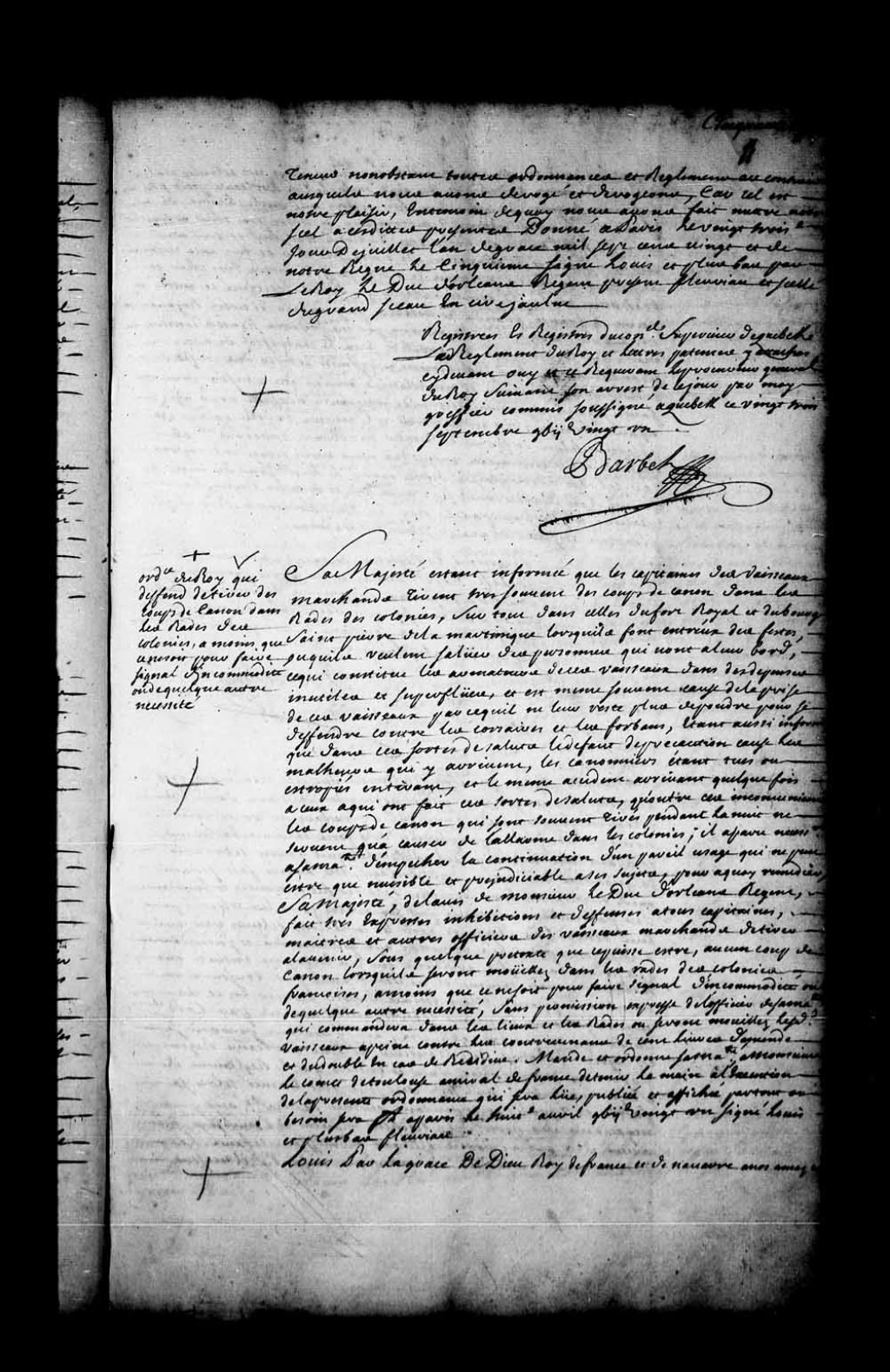 Ordre du Roi défendant de tirer des coups de canon dans les rades des colonies, à moins que ce ne soit pour faire signal d'incommodité ou de quelque autre nécessité, 8 avril 1721, Archives nationales à Québec, Fonds Conseil souverain, (03Q,TP1,S36,P600).