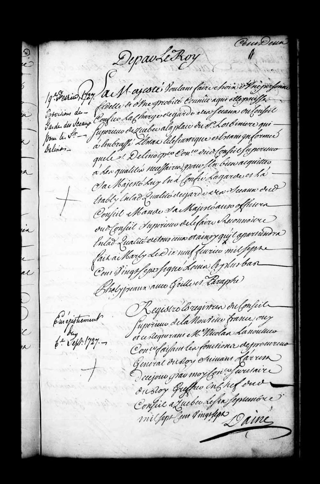 Lettres de provisions par Sa Majesté de l'office de garde des sceaux du Conseil supérieur de Québec pour le sieur Martin de Lino (DeLino), premier conseiller audit Conseil, à la place du sieur Chartier de Lotbinière, qui a embrassé l'état ecclésiastique