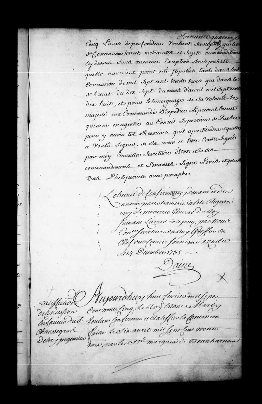 Brevet de confirmation et de ratification par Sa Majesté en faveur du sieur Chaussegros de Léry, ingénieur en chef dans les places de la Nouvelle-France, d'une concession lui ayant été accordée le 6 avril 1733 par Charles de Boische, Marquis de Beauharnois, et Gilles Hocquart, gouverneur et intendant de la Nouvelle-France, consistant en un terrain en seigneurie de deux lieues de front le long de la rivière Chambly (Richelieu) sur trois lieues de profondeur à prendre depuis la borne de la seigneurie de Longueuil qui va au nord-ouest en remontant vers le lac Champlain, laquelle étendue sera bornée au côté du nord par la seigneurie du sieur de Longueuil sur la même ligne, du côté du sud à deux lieues de ladite seigneurie, sur le devant par la rivière Chambly et sur la profondeur à trois lieues joignant les terres non concédées