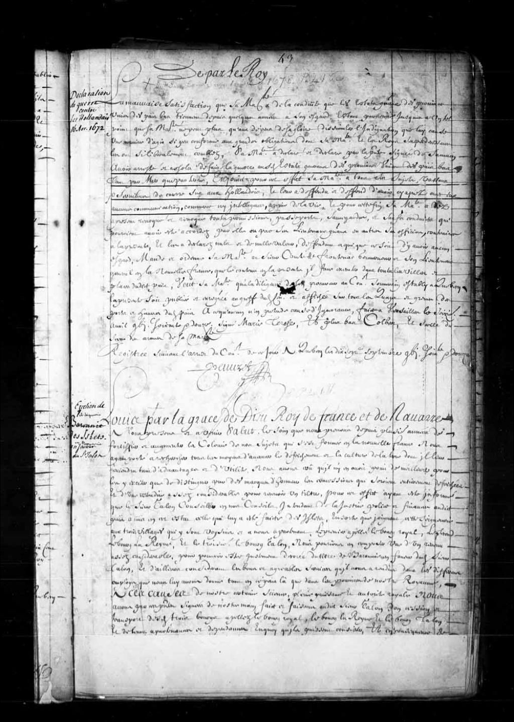 Déclaration de guerre du Roi contre les Hollandais et les États généraux des Provinces unies des Pays-Bas, 16 avril 1672, Archives nationales à Québec, Fonds Conseil souverain, (03Q,TP1,S36,P82).