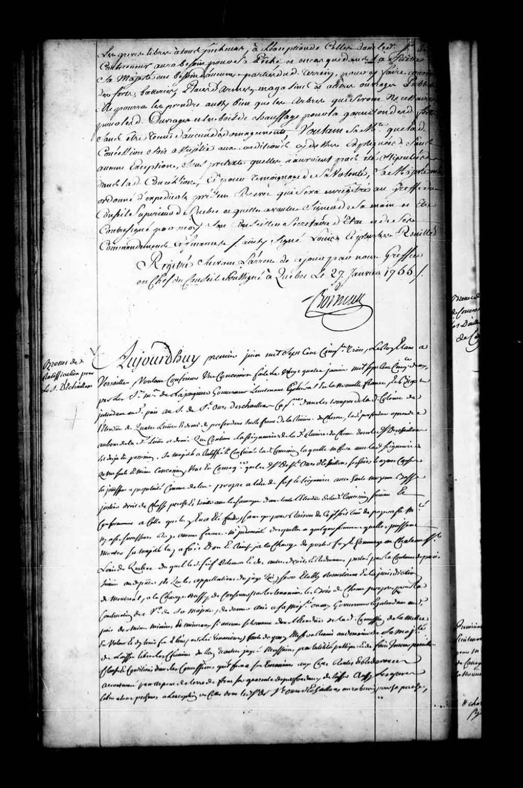 Brevet de confirmation et de ratification par Sa Majesté en faveur du sieur de Saint-Ours Deschaillons, capitaine dans les troupes du détachement de la Marine, d'une concession lui ayant été faite le 24 janvier 1752 par Jacques-Pierre de Taffanel, Marquis de la Jonquière, et François Bigot, gouverneur et intendant de la Nouvelle-France, laquelle concession consistant en une étendue de quatre lieues et demie de profondeur sur le front de la rivière Duchesne, ladite profondeur à prendre au bout de ladite lieue et demie que contient la seigneurie de ladite rivière Duchesne dont ledit Deschaillons a déjà la possession, à titre de fief et seigneurie