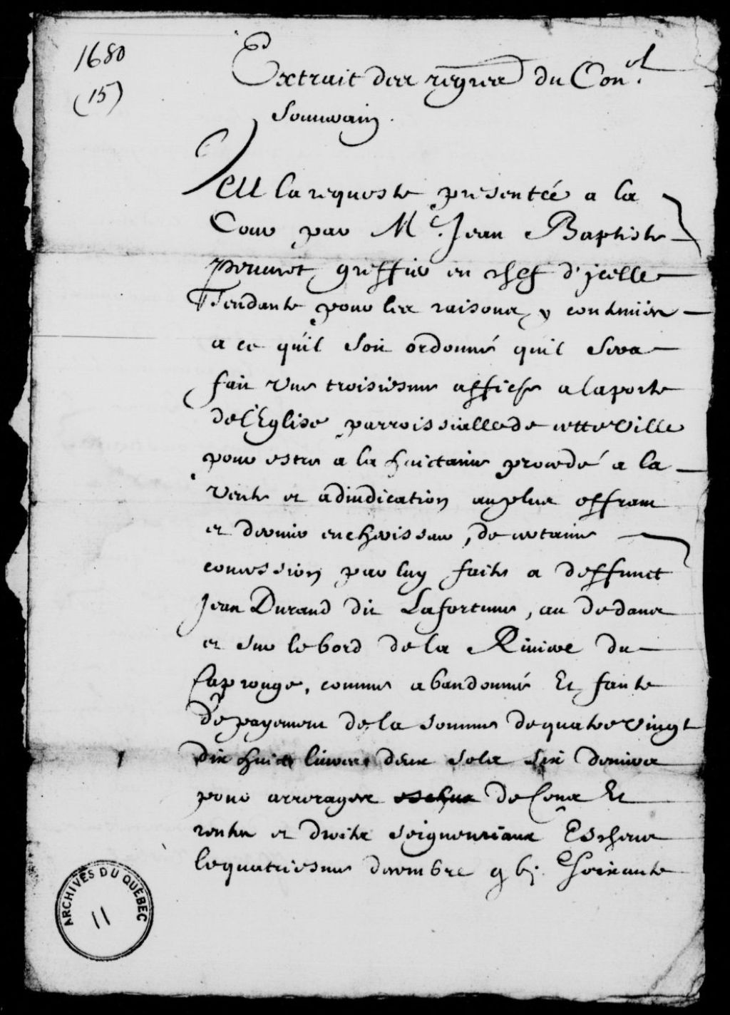 Arrêt ordonnant sur la requête de maître Jean-Baptiste Peuvret, greffier en chef du Conseil souverain de Québec, que de nouvelles affiches soient posées sur la porte de l'église paroissiale pour la vente d'une terre au Cap-Rouge appartenant à la communauté qui a existé entre feu Jean Durand dit Lafontaine et sa femme, à présent femme de Jacques Couturier, 8 janvier 1680, Archives nationales à Québec, Fonds Conseil souverain, (03Q,TP1,S37,D11).