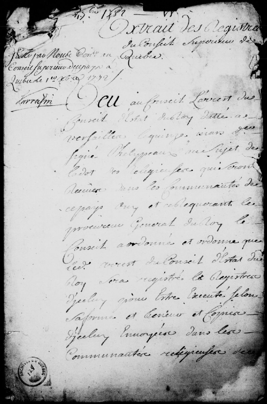 Ordonnance du Conseil supérieur de Québec pour l'enregistrement et la communication aux communautés religieuses de l'arrêt du Conseil supérieur de Québec en date du 15 mars 1732, concernant la dot des religieuses