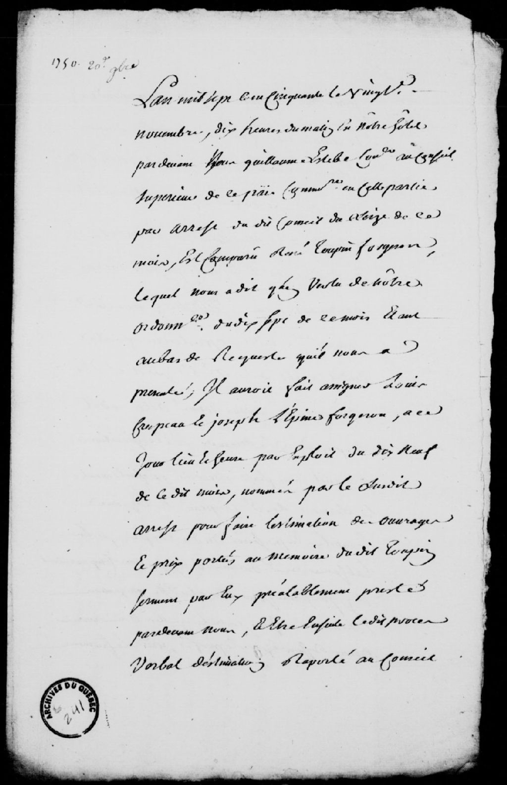 Prestation de serment de Louis Crépeau et Joseph Lépine, experts, pour l'estimation des ouvrages de René Toupin, forgeron, en faveur des religieuses de l'Hôpital général, dont le conseiller Estèbe tiendra compte dans son rapport au Conseil supérieur de Québec; signification auxdites religieuses par l'huissier Clesse, 20 novembre 1750, Archives nationales à Québec, Fonds Conseil souverain, (03Q,TP1,S37,D241).