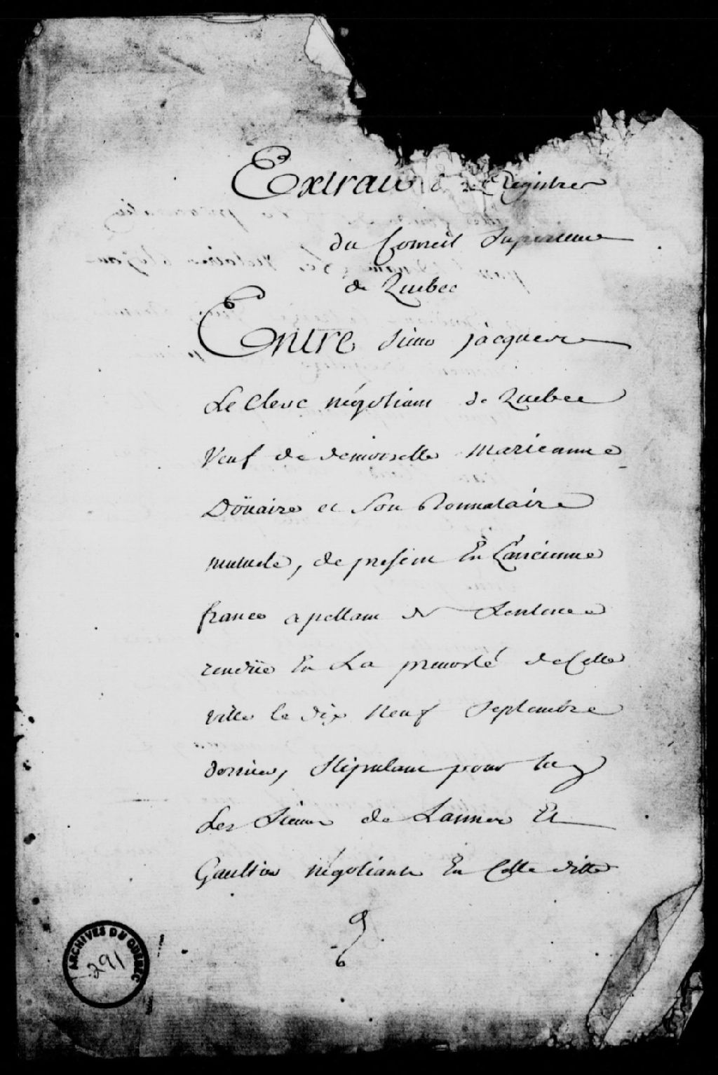Appel mis à néant dans la cause entre Jacques Leclerc, négociant de Québec, veuf de Marie-Anne Douaire, et son donataire mutuel, et Élisabeth Douaire, veuve de sieur Gilles Rageot de Beaurivage, héritière présomptive; signification aux sieurs Parent et Taché, qui représentent ledit Leclerc, 2 octobre 1758, Archives nationales à Québec, Fonds Conseil souverain, (03Q,TP1,S37,D291).