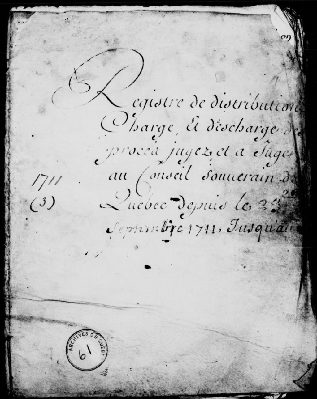 Registre de distribution, charge et décharge des procès jugés et à juger au Conseil souverain de Québec, 23 septembre 1711 - 18 janvier 1716, Archives nationales à Québec, Fonds Conseil souverain, (03Q,TP1,S37,D61).
