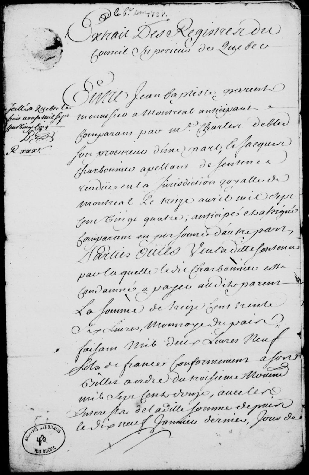 Arrêt qui ordonne que Jean-Baptiste Parent et Jacques Charbonnier poursuivront conjointement la veuve d'Étienne Campeau conformément à l'acte passé entre les parties le 25 octobre 1724, et, après avoir entendu le sieur DeBled (Deblé) en qualité de tuteur des enfants mineurs de feu André Jorian sur la saisie faite à sa requête entre les mains du feu sieur Campeau le 19 juillet 1720, le Conseil supérieur de Québec évoque l'instance de ladite saisie et y faisant droit la déclare nulle et fait mainlevée audit Charbonnier, 6 août 1725, Archives nationales à Québec, Fonds Conseil souverain, (03Q,TP1,S37,D83).