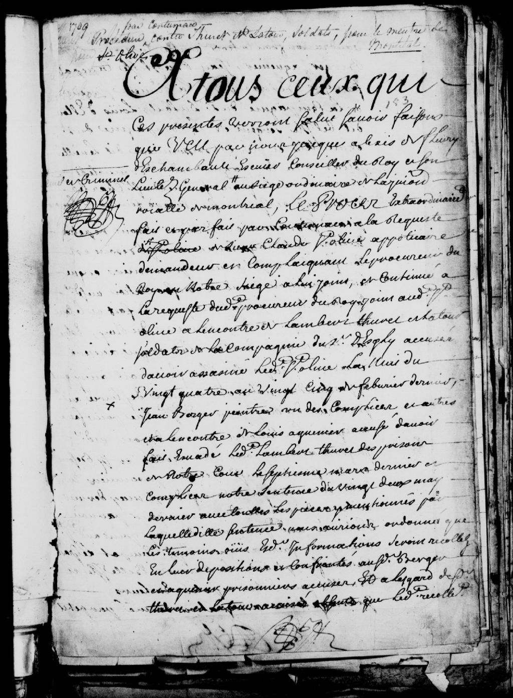 Procès fait par contumace (défaut de comparaître au tribunal), à la requête de Claude Boiteux de Saint-Olive, apothicaire, demandeur, contre Lambert Thuret (Churet) et Latour, soldats de la compagnie de François Mariauchau, sieur d'Esgly, accusés d'avoir voulu assassiner le demandeur, Jean Berger, peintre, prisonnier, un des complices, accusé d'avoir composé une chanson diffamatoire sur le demandeur, Louis Haguenier, prisonnier, accusé d'avoir fait évader Lambert Thuret des prisons, Marie-Anne Legras, accusée d'avoir sollicité, poussé et instruit Louis Haguenier à faire son acte