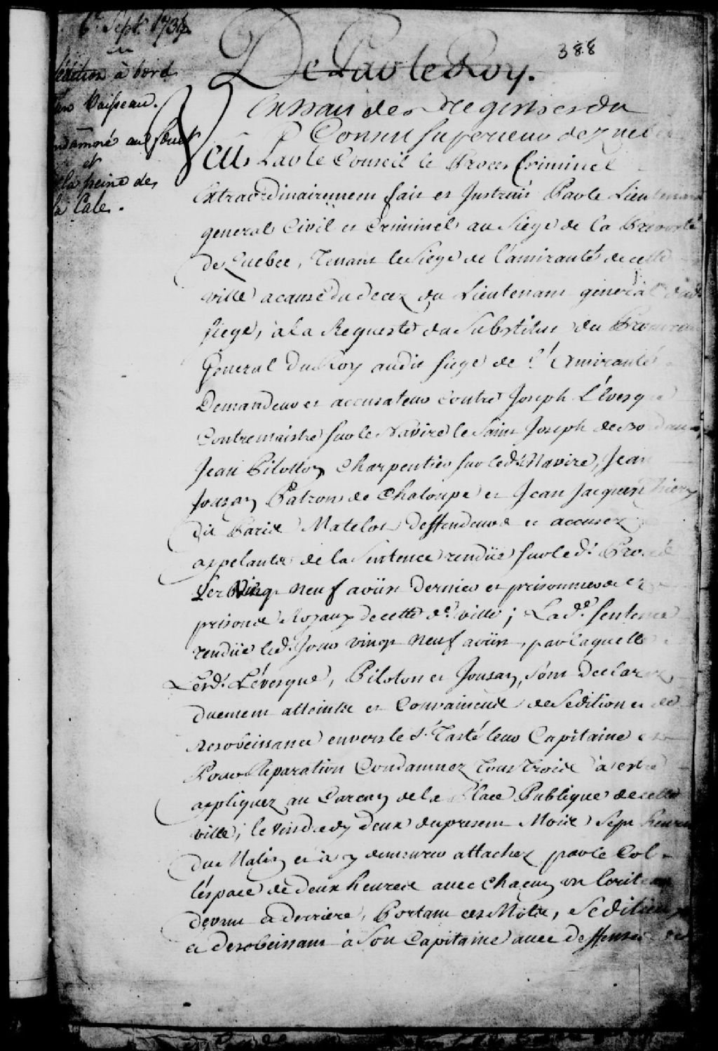 Arrêt du Conseil supérieur de Québec au procès de Joseph Lévesque (Lévêque), contremaître sur le navire «le Saint-Joseph» de Bordeaux, Jean Pilotton, charpentier sur ledit navire, Jean Jousan, patron de chaloupe, Jean-Jacques Thierry dit Paris, matelot, prisonniers, appelants de la sentence rendue le 29 août 1735 par la Prévôté de Québec, accusés de sédition et de désobéissance envers le sieur Tasté, leur capitaine, 6 septembre 1735, Archives nationales à Québec, Fonds Conseil souverain, (03Q,TP1,S777,D154).