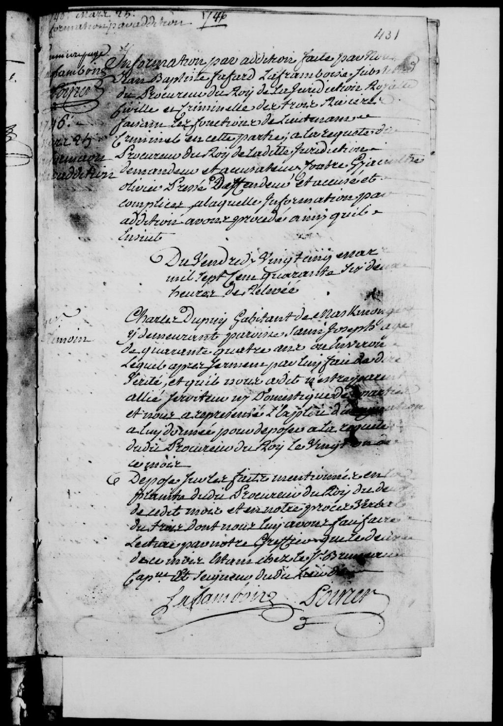 - Ce dossier provient de la Juridiction royale des Trois-Rivières. Ce dossier contient les interrogatoires ou les dépositions des personnes suivantes : Charles Dupuis (Dupuy), environ 44 ans, habitant de Maskinongé, y demeurant, paroisse Saint-Joseph; Joseph Dehornay dit Laneuville, environ 40 ans, habitant, demeurant au quartier de Maskinongé, paroisse Saint-Joseph; Guillaume Vacher dit Lacerte, environ 47 ans, charretier, demeurant à Trois-Rivières, paroisse Notre-Dame