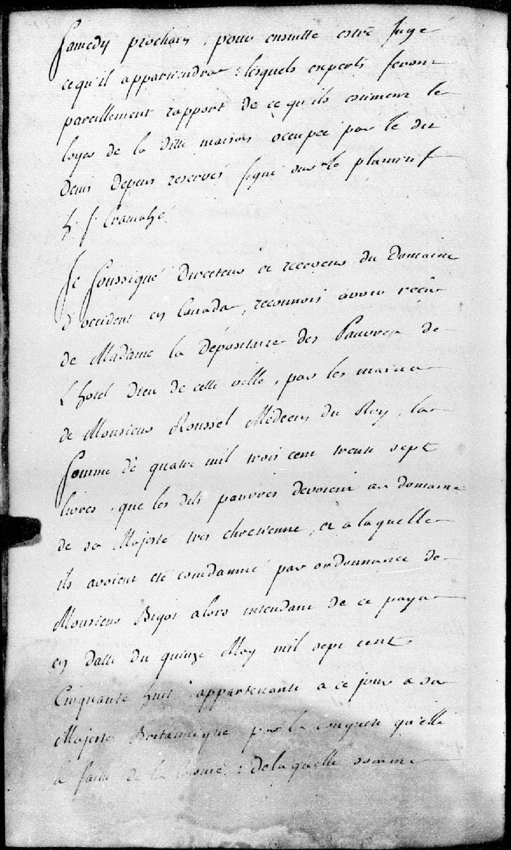 - Reconnaît avoir reçu des mains de monsieur Roussel, médecin du Roi, la somme de 4337 livres que lesdits pauvres devaient au domaine de Sa Majesté très chrétienne et à laquelle ils avaient été condamnés par ordonnance de monsieur Bigot, alors intendant de ce pays, en date du 15 mai 1758, appartenant à ce jour à Sa Majesté britannique par la conquête qu'elle a faite de la colonie, de laquelle somme ci-dessus elle tient quitte au nom desdits pauvres et tous les autres à Québec, le 1er octobre 1760, signé De la Fontaine