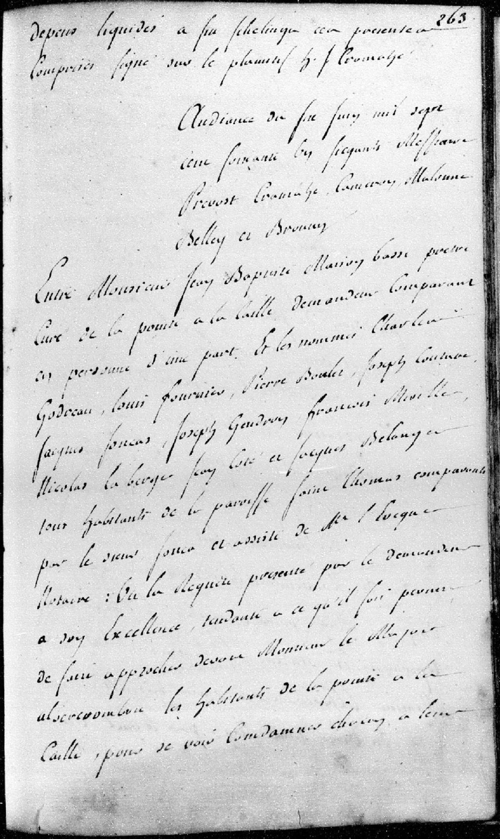 Entre Jean-Baptiste Maison Basse (Maisonbasse), prête curé de la Pointe-à-la-Caille, demandeur, et les nommés Charles Godreau (Gaudreau), Louis Fournier, Pierre Boulet, Joseph Couture, Jacques Joncas, Joseph Gendron, François Miville, Nicolas La Berge (Laberge), Jean Coté et Jacques Bélanger, habitants de la Pointe-à-la-Caille, défendeurs. Requête présentée afin que les défendeurs soient condamnés à payer pour les réparations du presbytère, 6 juin 1761, Archives nationales à Québec, Fonds Conseil militaire de Québec, (03Q,TL9,P1333).