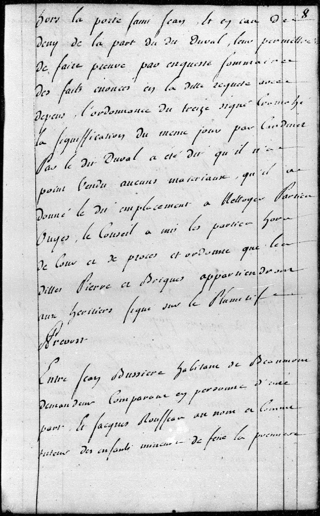 Entre Jean Bussière, habitant de Beaumont, demandeur, et Jacques Rousseau, au nom et comme tuteur des enfants mineurs, défendeur. Le Conseil ordonne que ledit Bussière jouira des deux arpents de terre du chef de sa femme à l'exception des parts vendues par les héritiers, 17 juin 1761, Archives nationales à Québec, Fonds Conseil militaire de Québec, (03Q,TL9,P2008).