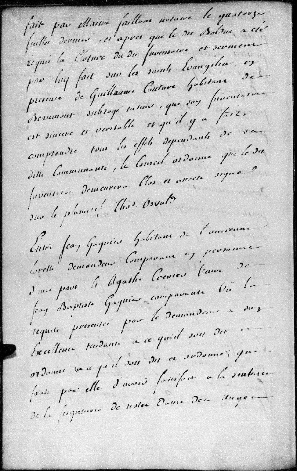 Entre Jean Gagnier (Gagné), habitant de l'Ancienne-Lorette, demandeur, et Agathe Crevier, veuve de Jean Baptiste Gagnier, défendeur. Requête présentée par le demandeur afin que la donation faite par lui soit résiliée, 10 octobre 1761, Archives nationales à Québec, Fonds Conseil militaire de Québec, (03Q,TL9,P3035).