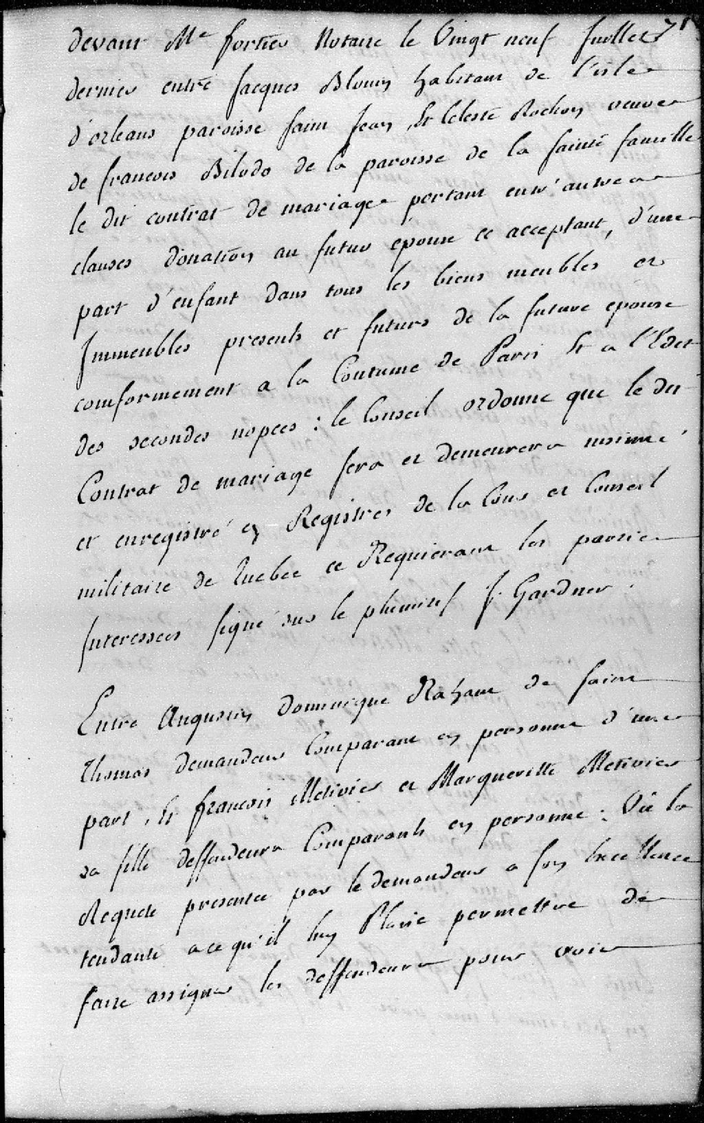 Entre Augustin-Dominique Rabaut (Rabot, Rabaut)de Saint-Thomas, demandeur, et François Métivier et Marguerite Métivier, sa fille, défendeurs. Le Conseil déclare l'opposition faite par la dite Métivier nulle, ordonne qu'il sera procédé et passé outre au dit mariage, et condamne ladite Métivier pour tous dommages et aux dépens liquidés à 18 shillings, 7 novembre 1761, Archives nationales à Québec, Fonds Conseil militaire de Québec, (03Q,TL9,P3120).