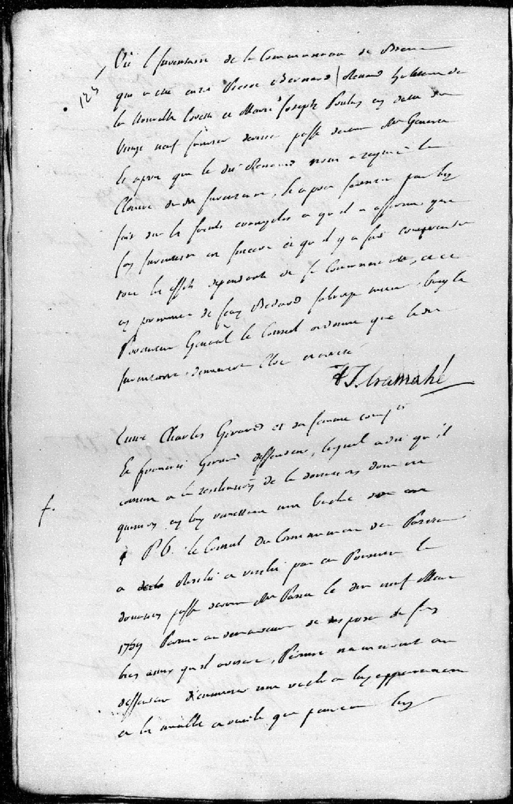 Entre Charles Girard et sa femme, demandeurs, et François Girard, défendeur. Le Conseil, suivant le consentement des parties, a résilié la donation, 18 février 1761, Archives nationales à Québec, Fonds Conseil militaire de Québec, (03Q,TL9,P6126).