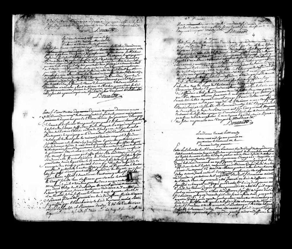 Cause entre Jean Dousset (Doucet), contremaître engagé sur le navire le Philibert, contre le sieur Jacques Fourneau, capitaine dudit navire. Le demandeur réclame la somme de 48 livres pour les 32 jours qu’il a travaillé à bord dudit navire en sa qualité de contremaître. Ledit Dousset est condamné à retourner à bord du navire pour servir en la qualité de contremaître suivant l’engagement, sous peine de perdre les gages qui lui sont dus à présent, acquis en sa qualité.