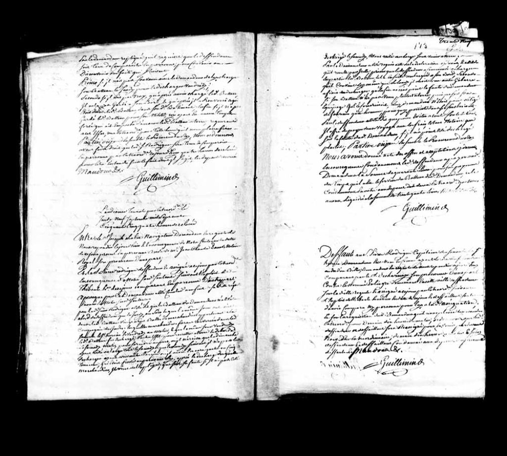 - Le titre complet de la pièce se lit comme suit : Cause entre le sieur Joseph Chabot, négociant, demandeur, assisté de maître Jean-Claude Panet, notaire royal, son procureur, contre le sieur Pierre Rodrigue, défendeur. Le défendeur est assigné suite à la sentence du tribunal de ce matin. Il plaide que le bateau Saint-Joseph n¿a été utilisé par le défendeur que le jeudi et que 27 balles de marchandises appartenant à la Compagnie des Indes ont été chargées dans le bateau pour être transbordées au Saint-Hursin le vendredi. Ensuite, le Saint-Joseph fut déchargé, terminant le samedi matin, et fut ramené au port seulement le dimanche étant resté au large le samedi après-midi. Le lundi, le défendeur n¿a pu décharger le Saint-Joseph ayant une autre barque affrétée à bord de laquelle il avait quatre ou cinq tonneaux à débarquer. Le défendeur soumet que le Saint-Joseph aurait été déchargé le samedi s¿il n¿était pas resté au large, de par la faute du demandeur. Le demandeur requiert acte de l¿aveu du défendeur qu¿il avait une autre gabarre à décharger le lundi sans la faute du demandeur et que l¿équipage du défendeur naviguait le Saint-Joseph, le demandeur n¿ayant fourni qu¿un seul homme à bord. Le défendeur maintient que la faute est du demandeur mais offre de payer deux voyages. Le tribunal donne acte aux offres et condamne ledit défendeur à payer audit demandeur la somme de 40 livres en paiement du temps qu¿il a eu en sa possession le bateau dudit demandeur. Ledit défendeur est condamné aux dépens liquidés à 34 livres.