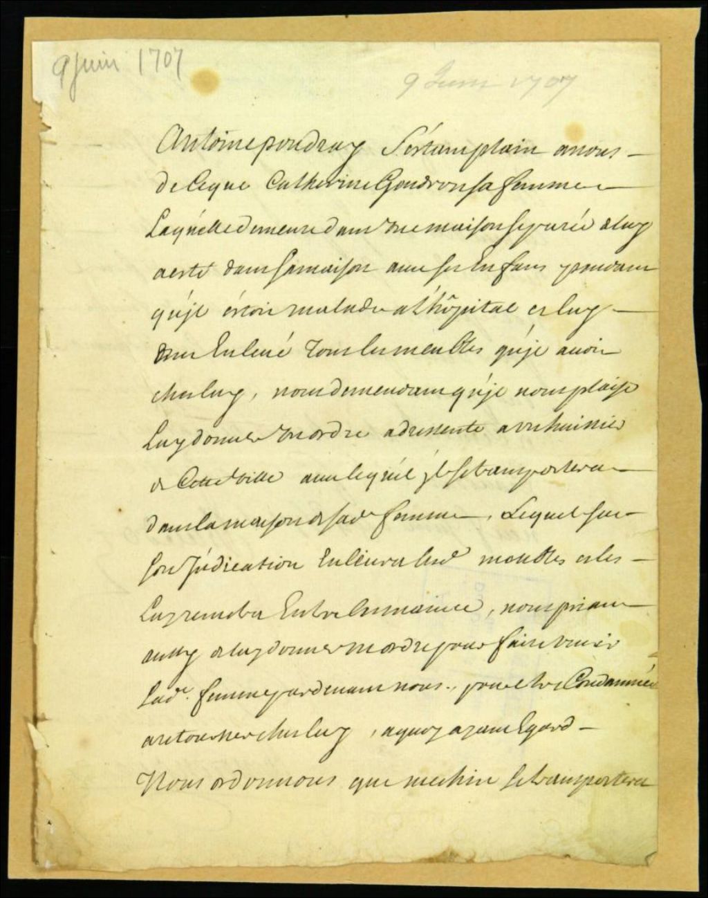 - Ce dossier de matière civile est composé de l'ordonnance de l'intendant Raudot dans un conflit où Antoine Poudret se plaint que sa femme Catherine Gendron, laquelle vit séparée dans un autre domicile a profité de son absence à l'hôpital pour lui enlever tous ses meubles. L'ordre est donné à l'huissier Meschin de reprendre les meubles