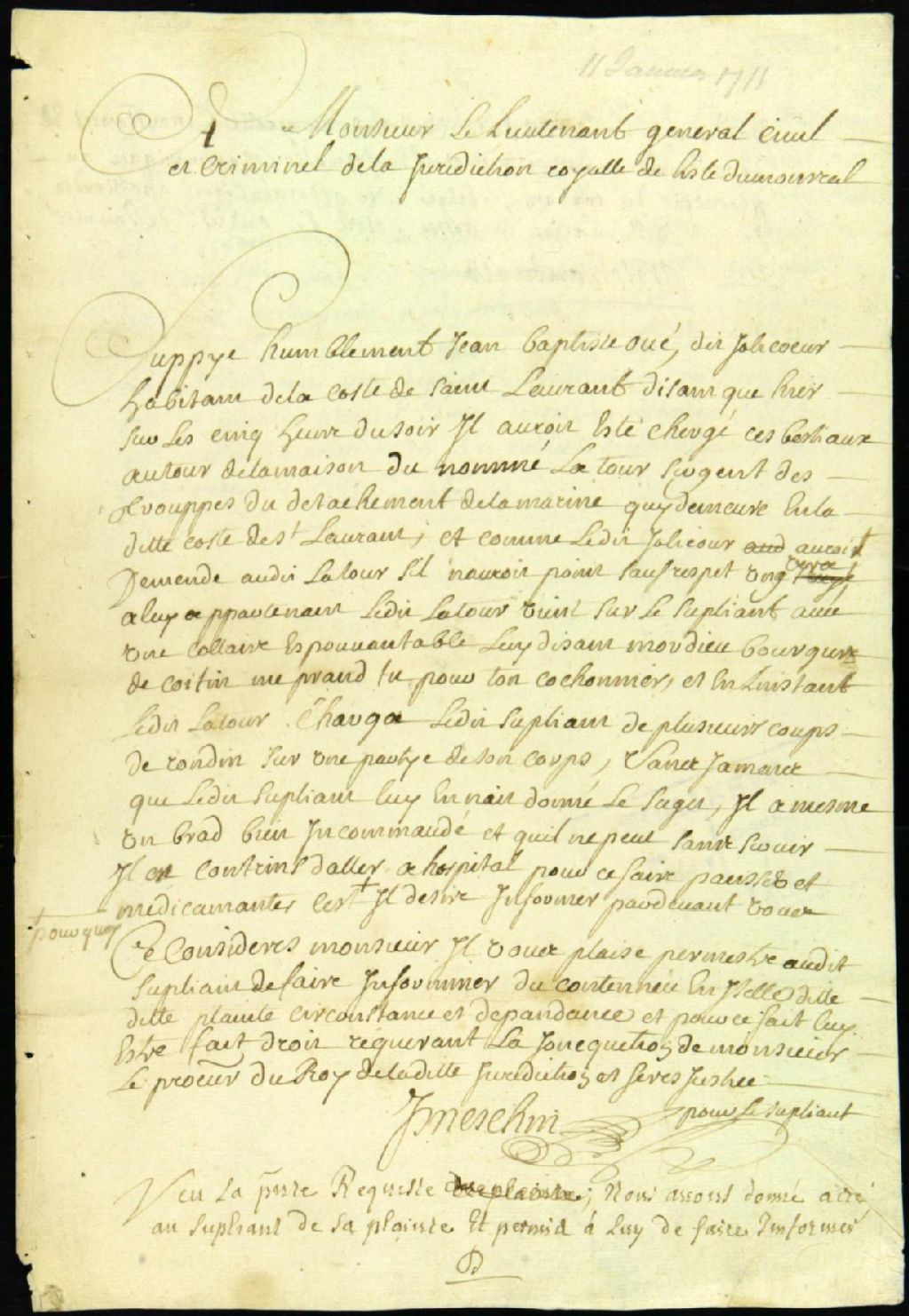 - Ce dossier de matière criminelle est composé des pièces suivantes : la plainte de Jean-Baptiste Houé dit Jolicoeur à l'effet qu'il a été frappé à coups de rondins de bois par le nommé François Jérôme dit Latour, sergent, alors qu'il était venu lui demander poliment s'il n'avait pas vu un de ses cochons sur ses terres; la demande pour la tenue d'une information; la permission de faire informer; l'ordre d'assigner les témoins et les assignations; la plainte de François Jérôme dit Latour disant avoir été agressé par un inconnu; la note du lieutenant; l'information judiciaire; la communication au procureur du roi lequel requiert "l'adjournement" de Latour et l'ordre "d'adjournement" à Latour pour être interrogé. Les témoins suivant sont mentionnés dans cette affaire : Barbe Achin, 35 ans, épouse de Tartre dit Larivière ; Tartre dit Larivière, 44 ans, Marie-René Averty, 19 ans, épouse de Bouchet
