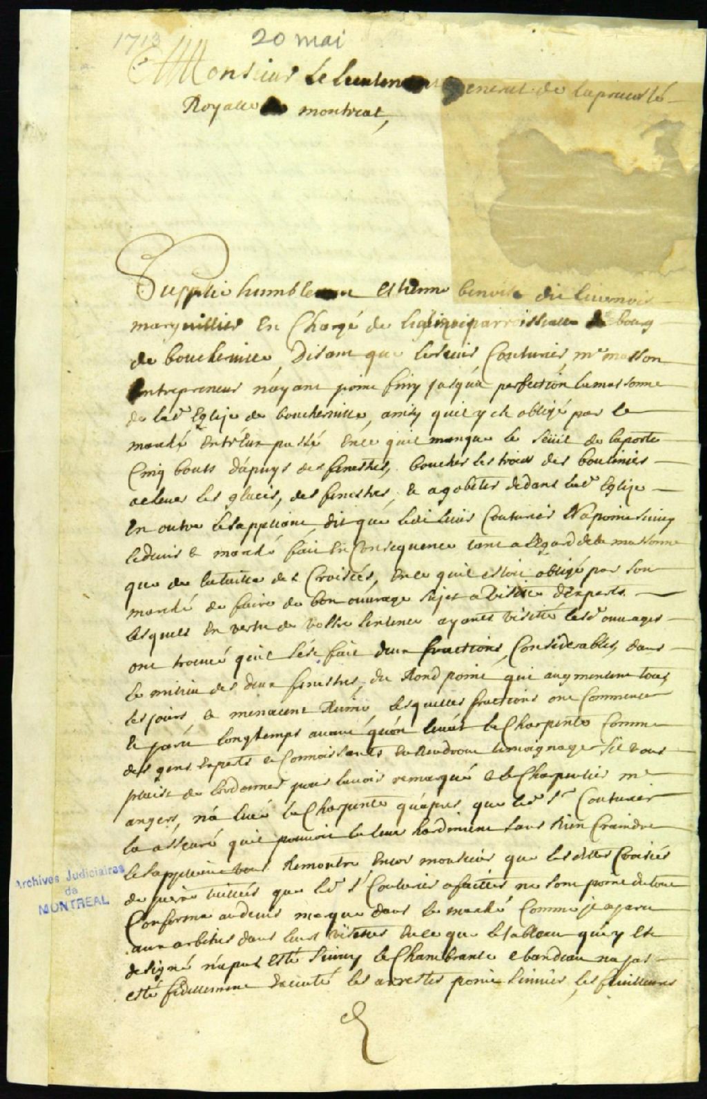 Procès entre Étienne Benoît dit Livernois, marguillier, demandeur, et Pierre Couturier, architecte, entrepreneur, défendeur, au sujet de travaux faits à l'église de Boucherville, 20 mai 1713 - 14 août 1713, Archives nationales à Montréal, Fonds Juridiction royale de Montréal, (06M,TL4,S1,D1447).