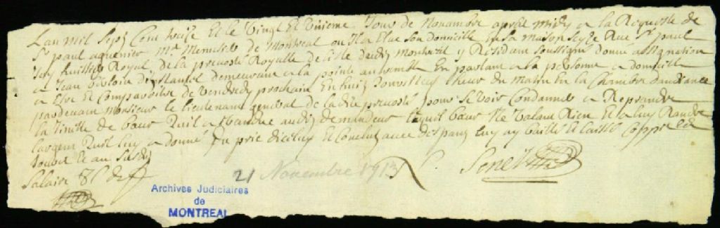 Procès entre Paul Haguenier, maître menuisier, demandeur, et Jean Berlouin dit Nantel, habitant de Pointe-aux-Trembles, défendeur, pour retour de beurre non comestible, 21 novembre 1713, Archives nationales à Montréal, Fonds Juridiction royale de Montréal, (06M,TL4,S1,D1514).