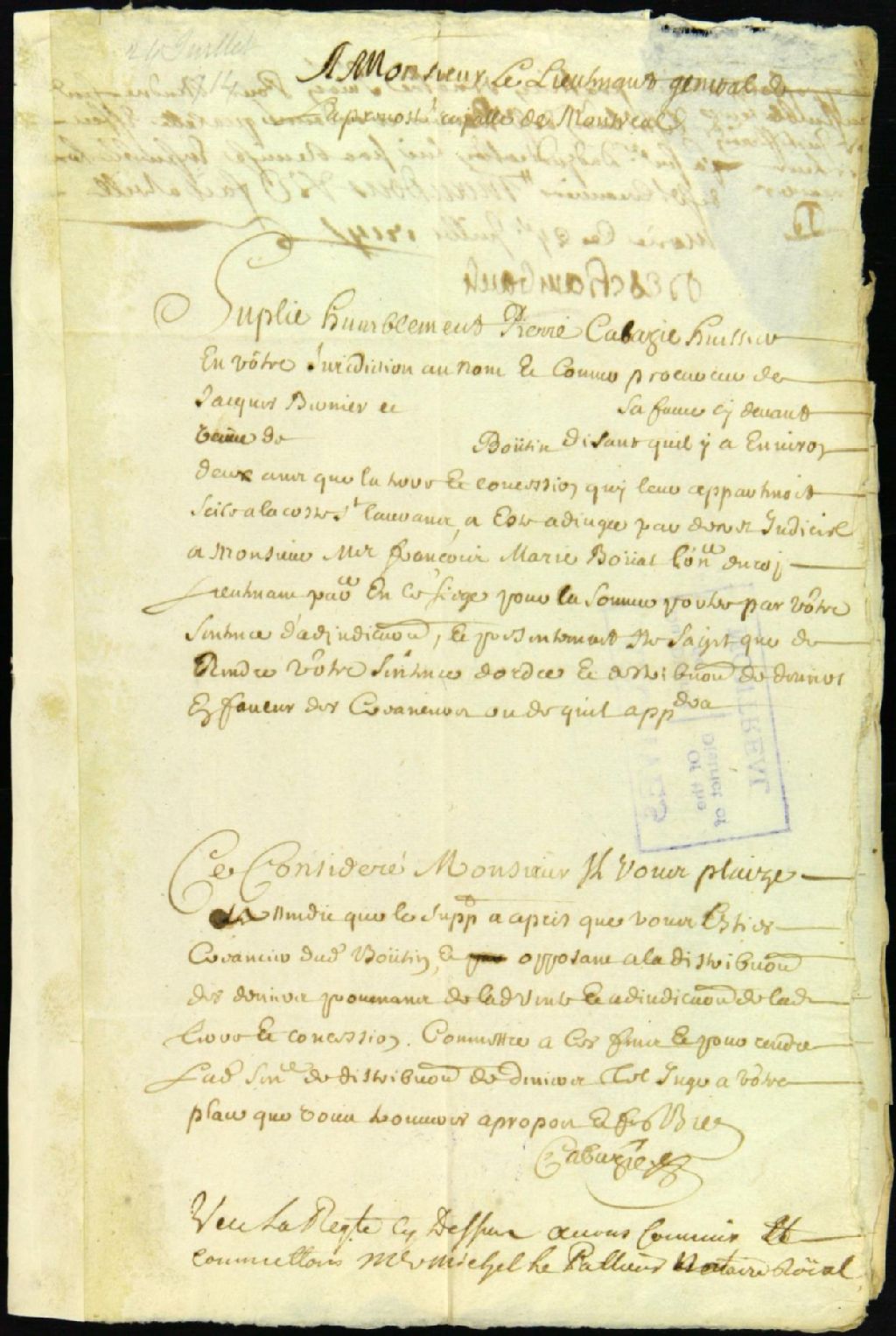 - Ce dossier d'administration judiciaire se compose des pièces suivantes : la requête de Pierre Cabazier en tant que procureur de Jacques Bernier et de sa femme Angélique Greslon, pour que soient distribués à François-Marie Bouat les biens provenant de l'adjudication de leur terre ; et la commission du huissier pour rendre la sentence en question