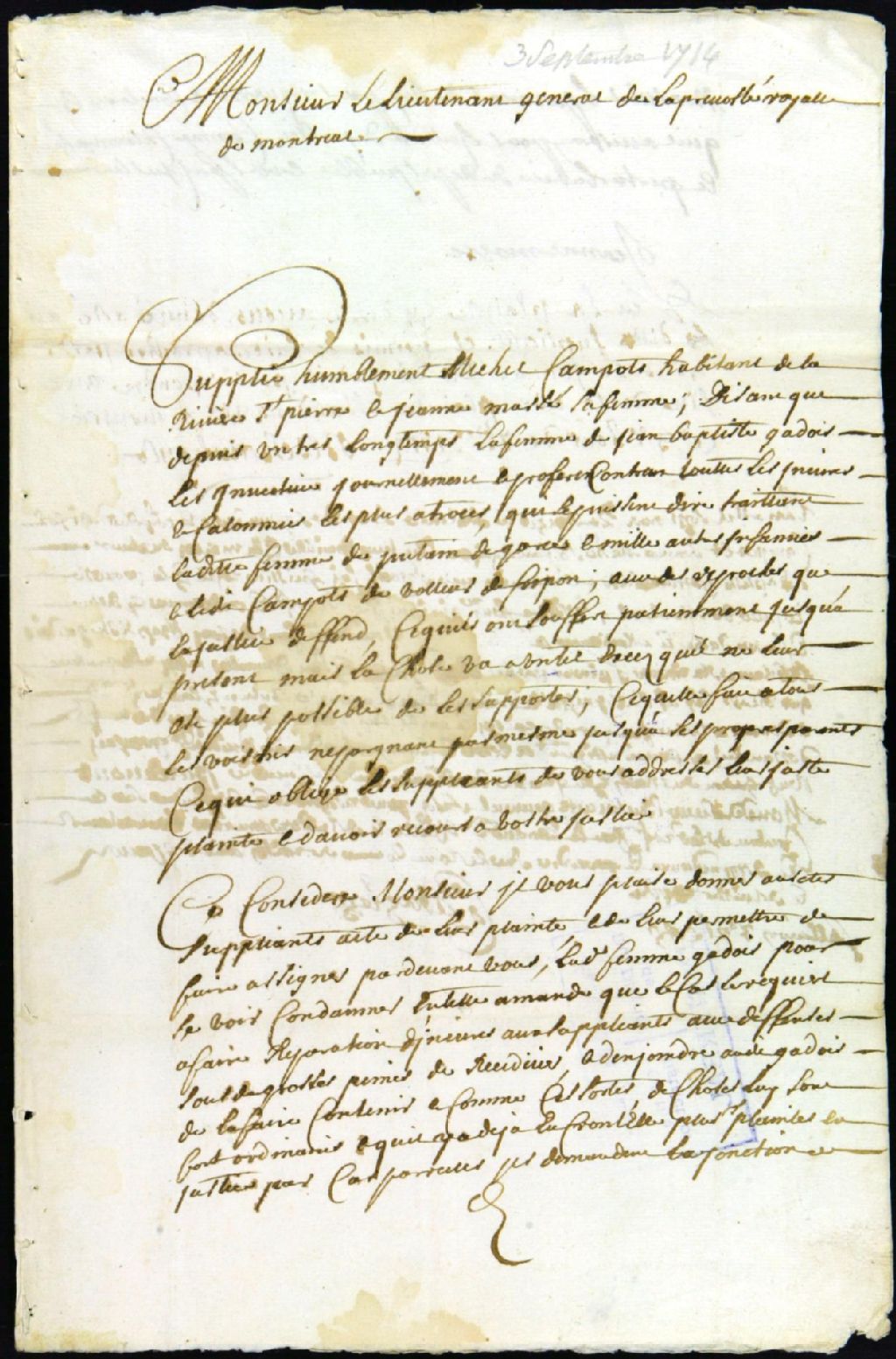 Procès entre Michel Campeau, époux de Jeanne Massé, habitant de Rivière St-Pierre, plaignant, et Marie Baudreau, épouse de Jean-Baptiste Gadois, accusée, pour insultes et calomnies, 3 septembre 1714 - 6 septembre 1714, Archives nationales à Montréal, Fonds Juridiction royale de Montréal, (06M,TL4,S1,D1616).