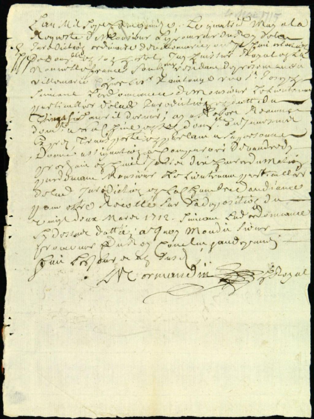 - Ce dossier de matière criminelle est composé de l'assignation servie à Robert Réaume pour le récolement de son témoignage dans une cause de voyage de traite dans l'Outaouais, sans permis ; la comparution de Réaume, avant son départ à Michillimakinac, pour procéder au récolement de sa déposition du 22 mars 1715
