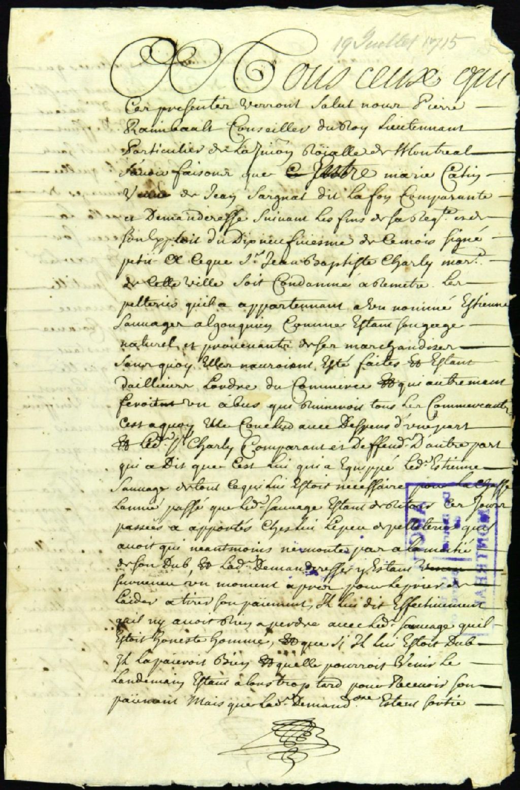 - Ce dossier de matière civile est composé de la transcription d'une sentence dans une poursuite intentée par Marie Catin contre Jean-Baptiste Charly pour se faire remettre les pelleteries d'un nommé Étienne, sauvage Algonquin, comme étant son gage pour le payement de marchandises. La signification du jugement à Charly et l'assignation complètent le dossier